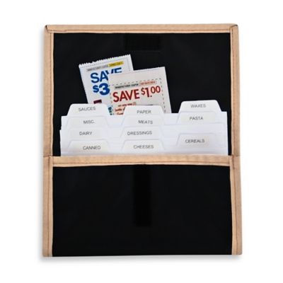 Coupon Organizer Wallet | Bed Bath & Beyond Just simply store your coupons in this wallet-sized organizer and have all of your deals at your fingertips. The Coupon Organizer Wallet is a very useful way to store all of your coupons in one place. Includes 24 tabbed paper dividers and 2 sheets of self-adhesive labels. Closes with hook and loop locking tabs. Can be attached to a shopping cart.